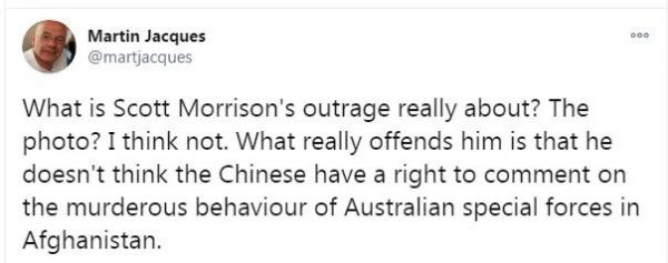 “莫里森的憤怒到底是什么?‘照片’?我想不是。真正令他惱怒的是,他認為中國人無權對澳大利亞特種部隊在阿富汗的謀殺行為發表評論。”