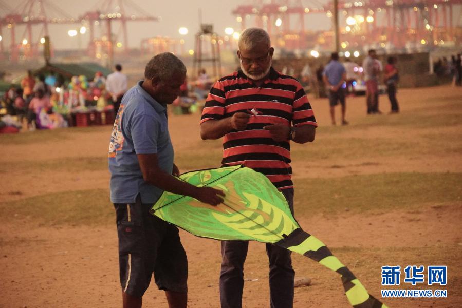 這張拍攝于2019年1月10日的資料照片顯示,納瓦(左)在斯里蘭卡首都科倫坡加勒菲斯綠地廣場上幫助一名游客調整風箏。新華社記者 唐璐 攝