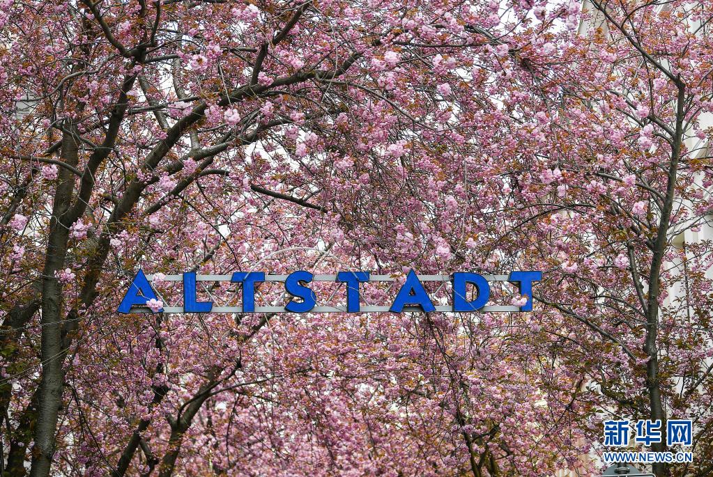 近日,德國西部城市波恩老城區的櫻花盛開,吸引了許多游人前來觀賞。