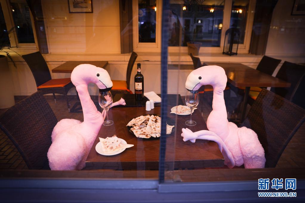 4月13日,波蘭首都華沙一家餐館將動(dòng)物玩偶擺放在靠窗座位上吸引顧客。