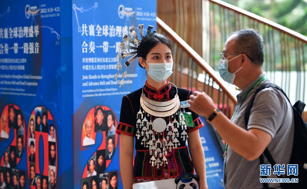 4月18日,身著黎族服飾的志愿者在博鰲亞洲論壇大酒店服務(wù)參會人員。