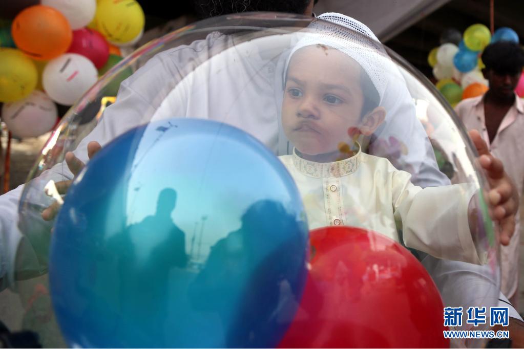 5月13日,在巴基斯坦南部城市卡拉奇,一名兒童在開齋節慶祝活動上玩氣球。新華社發