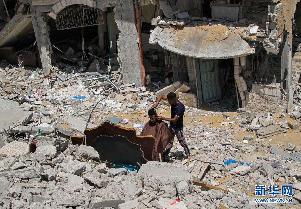 5月26日,在加沙地帶北部的城鎮(zhèn)貝特拉希亞,23歲的巴勒斯坦理發(fā)師阿卜杜拉·扎瓦拉在他被以色列炸毀的房屋前為顧客免費(fèi)服務(wù)。 新華社發(fā)(里澤克·阿卜杜勒·賈瓦德攝)
