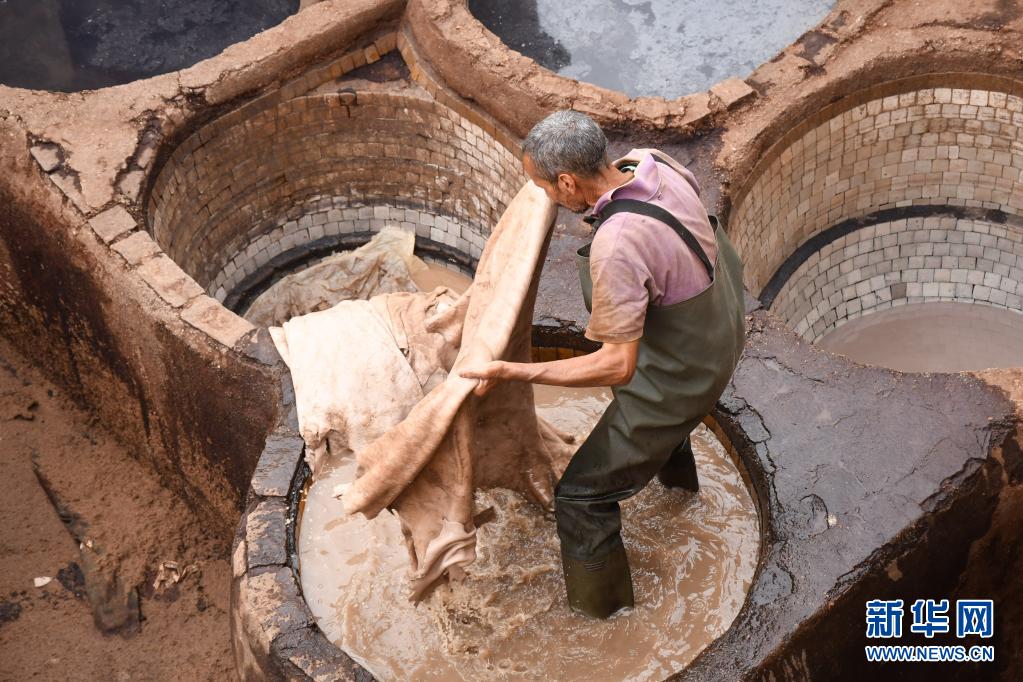 5月30日,工人正在摩洛哥非斯古城內的皮革染坊中勞作。