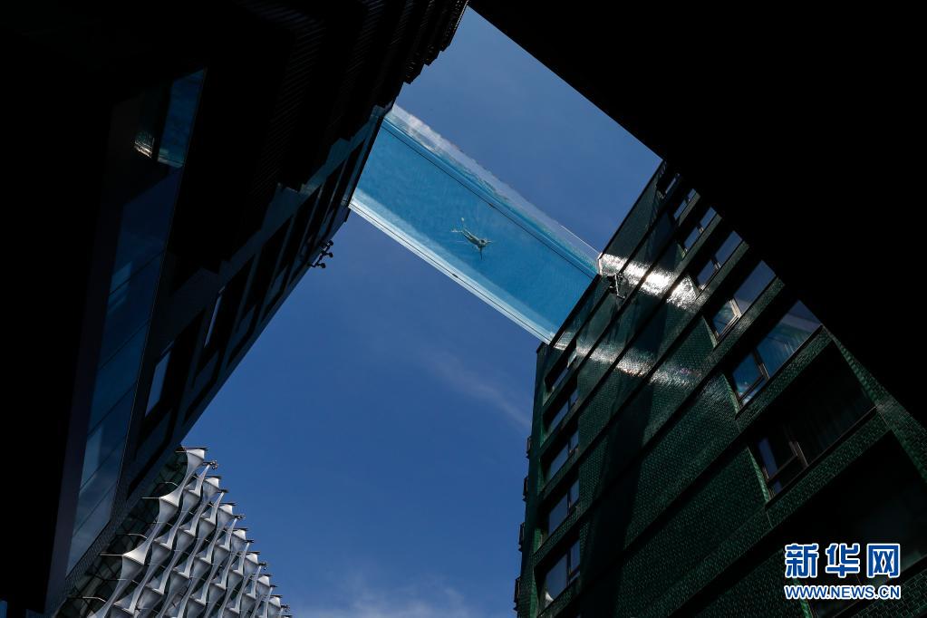 6月2日,一名女子在英國倫敦南部一個建造于兩棟公寓樓之間的“空中泳池”游泳。
